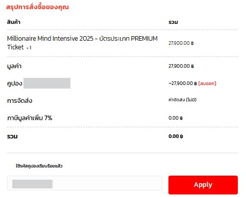 Millionaire Mind Intensive 2025 - บัตรประเภท VIP Ticket  × 1 33,900.00 ฿