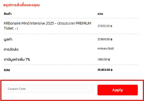 3. ใส่รหัสคูปองที่ท่านได้รับในอีเมลในช่อง coupon code และกดปุ่ม Apply (ตามรูปด้านล่างนี้)