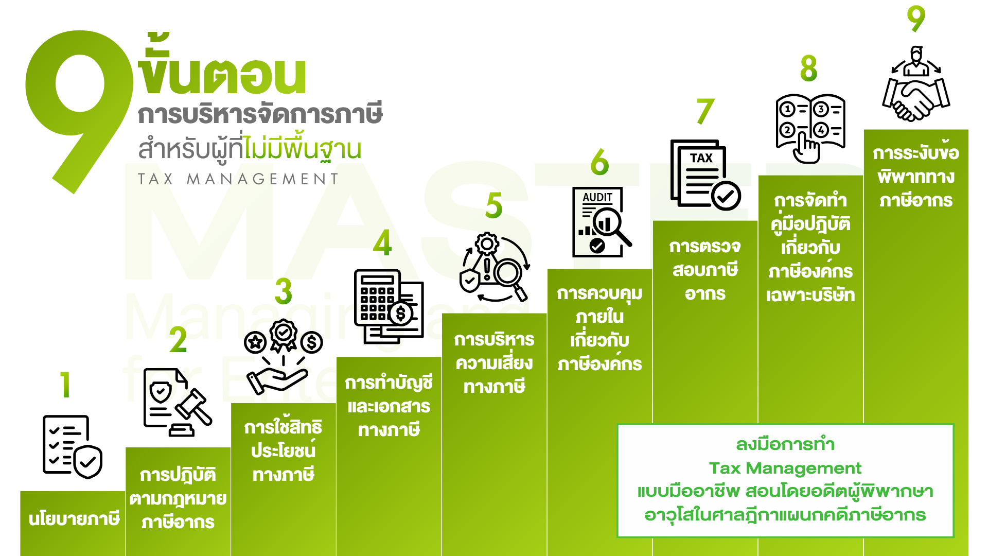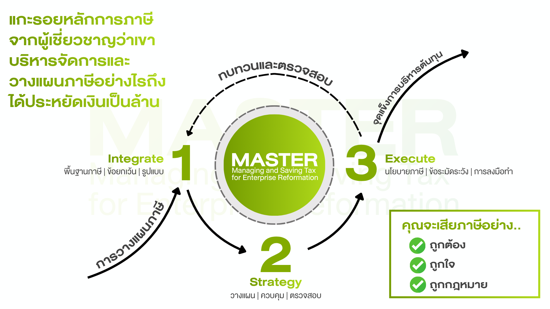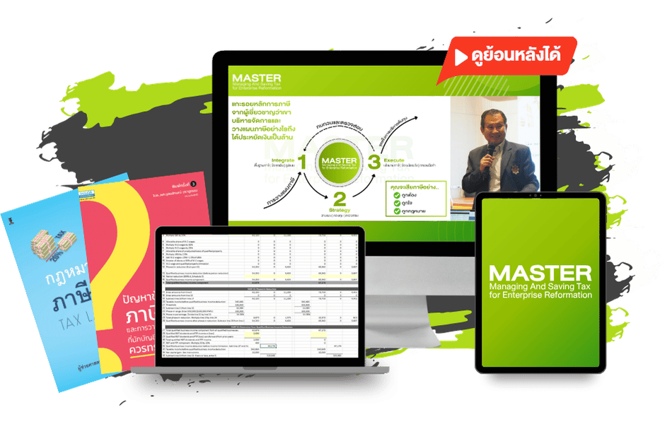 สิ่งหนึ่งที่ทำให้หลักสูตร MASTER: Managing And Saving Tax for Enterprise Reformation เป็นมากกว่าสัมมนาหรือหลักสูตรทั่วๆไป นั่นก็คือ คุณจะได้เรียนรู้อย่างเป็นขั้นตอนในการสร้างภูมิคุ้มกันทางภาษี ซึ่งเป็นสิ่งที่ทำได้ยากหากคุณเป็นธุรกิจที่ไม่มีที่ปรึกษาทางภาษี