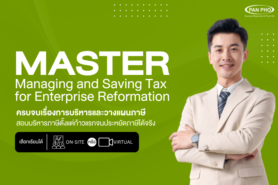 หลักสูตร MASTER: Managing And Saving Tax for Enterprise Reformation คือหลักสูตร 3 สัปดาห์ ออกแบบโดยบริษัท แพน โฟ จำกัด ร่วมกับผู้เชี่ยวชาญและที่ปรึกษาภาษีชั้นนำที่จะพาคุณไปเจาะลึกหลักการ เทคนิค และวิธีการ ทั้งทฤษฎีและปฎิบัติโดยผู้เชี่ยวชาญจากสถาบันและองค์กรชั้นนำของไทย ผ่านการกลั่นกรองและเรียบเรียงให้เข้าใจง่าย ใช้ได้จริงกับผู้เรียนที่ไม่มีพื้นฐานด้านภาษีและการวางแผนภาษีมาก่อน