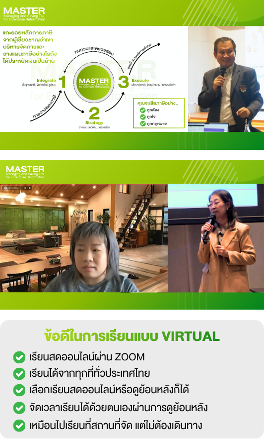 หลักสูตร MASTER: Managing And Saving Tax for Enterprise Reformation เป็นหลักสูตรอบรมแบบ Hybrid Experiences ที่ตอบโจทย์ให้กับผู้เรียนที่มีความต้องการต่างกันใน 2 รูปแบบ