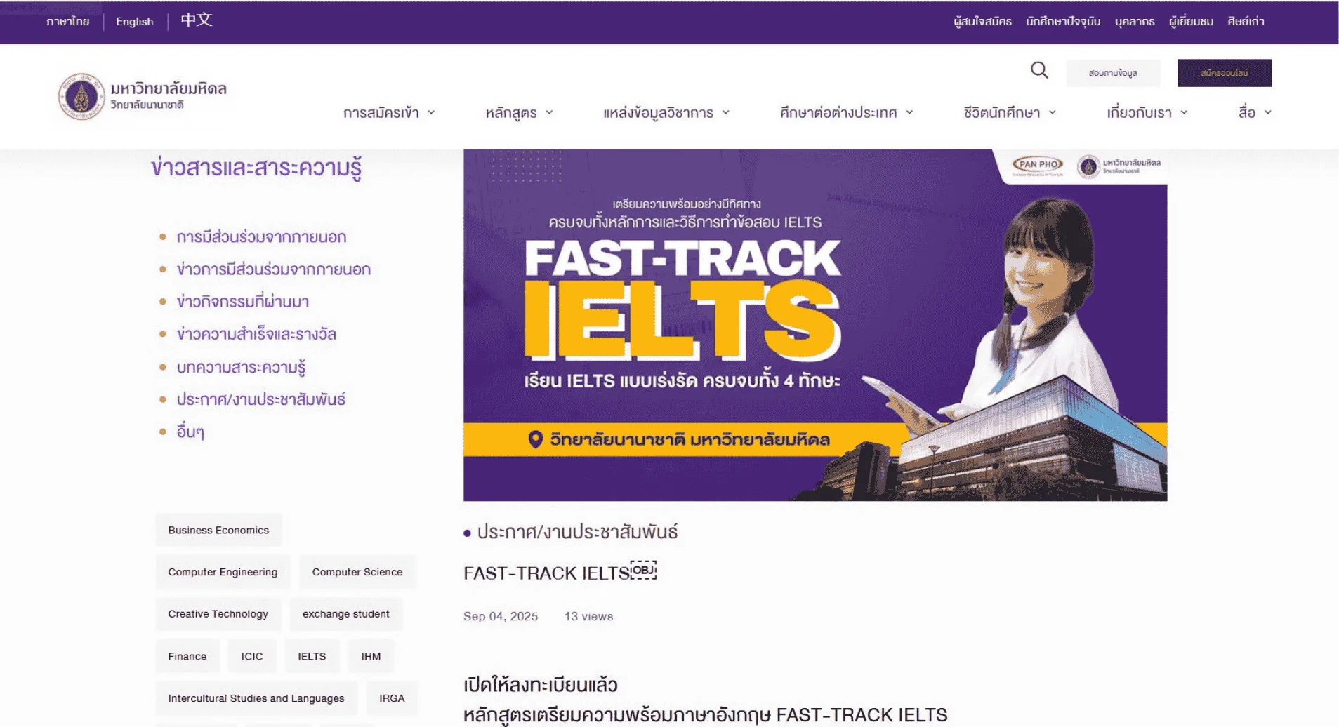 เตรียมความพร้อมสู่สนามสอบ IELTS อย่างมั่นใจ กับการเรียนการสอนแบบ On-site ณ วิทยาลัยนานาชาติ มหาวิทยาลัยมหิดล (ศาลายา) โดยคณาจารย์ผู้เชี่ยวชาญจากวิทยาลัยฯ ภายใต้บรรยากาศการเรียนที่กระตุ้นการมีส่วนร่วมเหมือนชั้นเรียนในระดับมหาวิทยาลัย สร้างแรงบันดาลใจ พร้อมพัฒนาทักษะอย่างมีทิศทาง