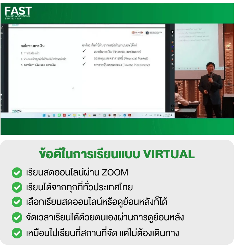 หลักสูตร FAST: Finance, Accounting, Strategy, and Tax คือหลักสูตร 4 สัปดาห์ ออกแบบโดยบริษัท แพน โฟ จำกัด ร่วมกับวิทยาลัยนานาชาติ มหาวิทยาลัยมหิดล (MUIC) ที่จะพาคุณไปเจาะลึกหลักการ วิธีคิด การวิเคราะห์ ทั้งทฤษฎีและปฎิบัติโดยผู้เชี่ยวชาญจากสถาบันและองค์กรชั้นนำของไทย ผ่านการกลั่นกรองและเรียบเรียงให้เข้าใจง่าย ใช้ได้จริงกับผู้เรียนที่ไม่มีพื้นฐานด้านการเงินหรือบัญชีมาก่อน