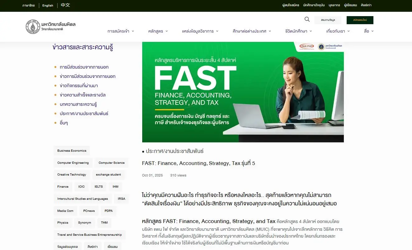 หลักสูตร FAST: Finance, Accounting, Strategy, and Tax ได้ถูกสร้างและออกแบบจากบริษัท แพน โฟ จำกัด และวิทยาลัยนานาชาติ มหาวิทยาลัยมหิดล ซึ่งได้รับการไว้วางใจในการจัดจำหน่ายและประชาสัมพันธ์แต่เพียงผู้เดียว ทั้งนี้ สามารถเข้าดูรายละเอียดความร่วมมือระหว่างวิทยาลัยนานาชาติ มหาวิทยาลัยมหิดลได้ที่ปุ่มด้านล่าง