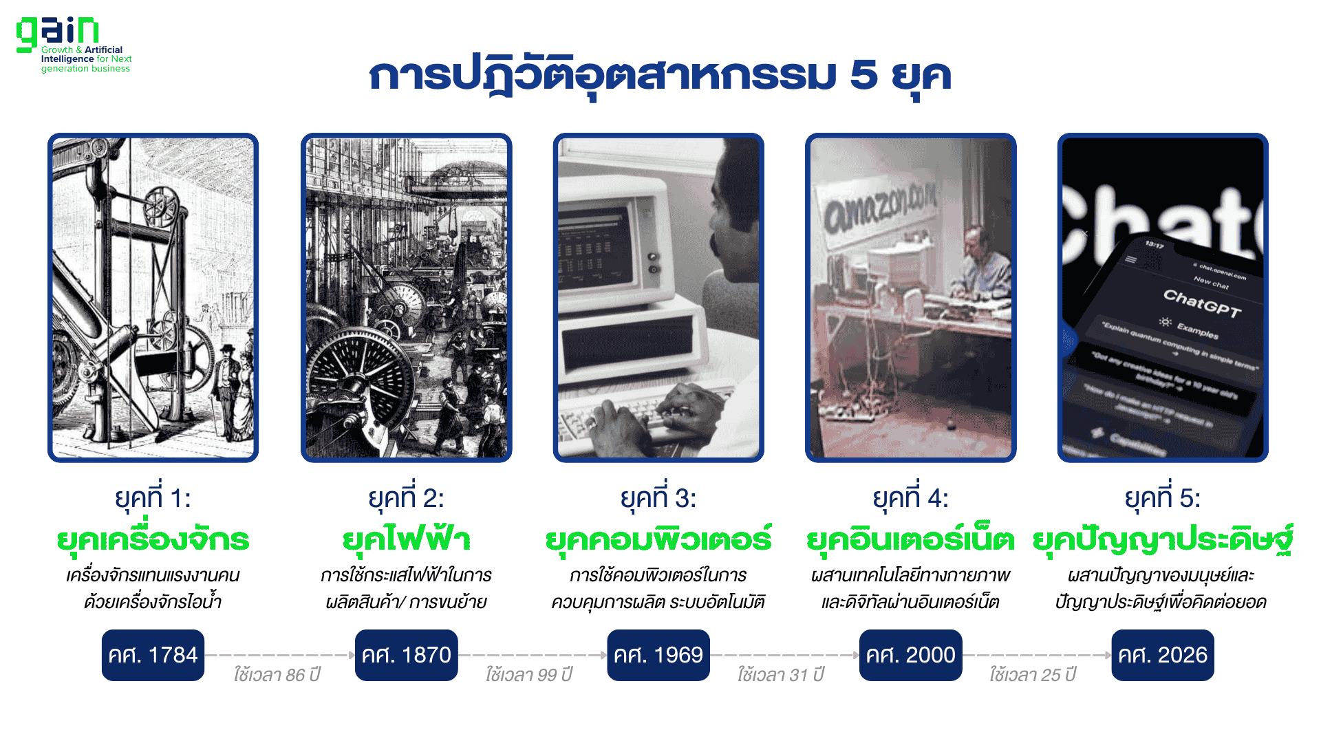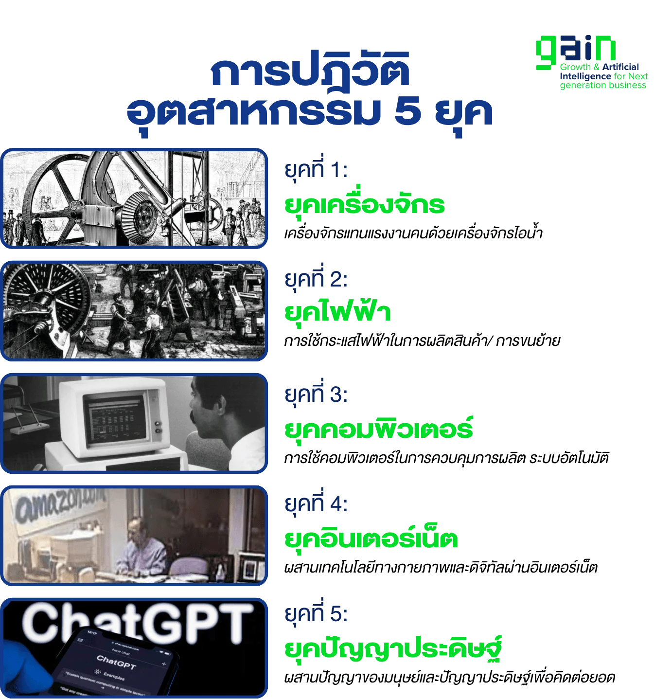 กาลเวลาผ่านมา.. เรากำลังจะเข้าสู่การปฎิวัติอุตสาหกรรมครั้งที่ 5 นั่นคือการทำงานด้วยระบบ AI ในธุรกิจ ซึ่งไม่ว่าคุณจะชอบหรือไม่.. ความเป็นจริงก็จะยังคงเหมือนเดิมคือ คนที่พร้อมจะเปลี่ยนแปลงคือผู้ที่อยู่รอดและได้รับโอกาสที่ยอดเยี่ยมที่สุดในช่วงชีวิต ในขณะที่คนที่ไม่รู้หรือไม่คิดจะเปลี่ยนแปลง จะถูกคนกลุ่มแรกนั้นแย่งโอกาสไป