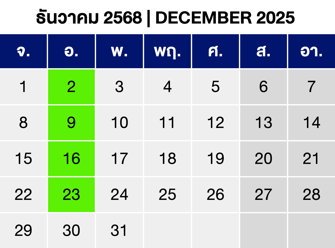 วันที่ 2, 9, 16, 23 ธันวาคม 2568