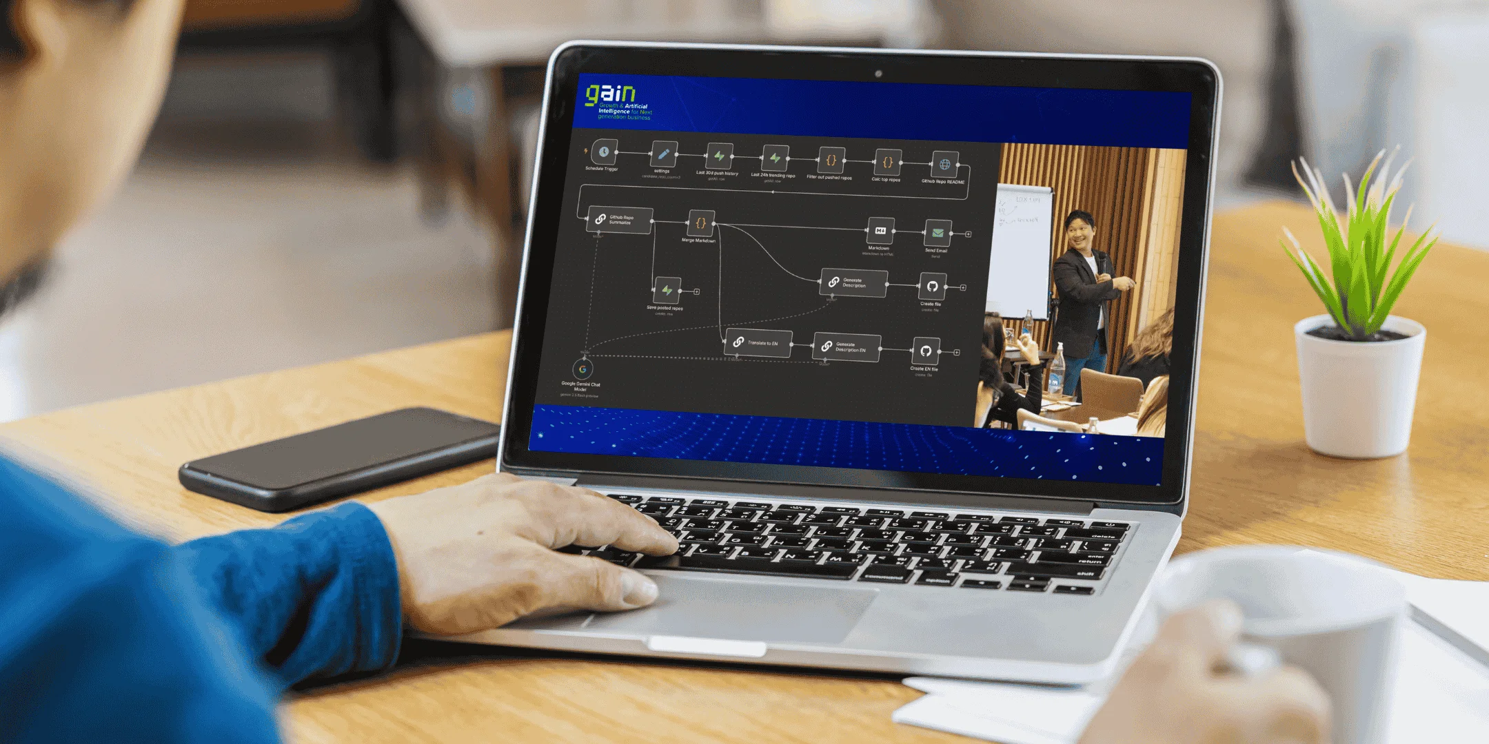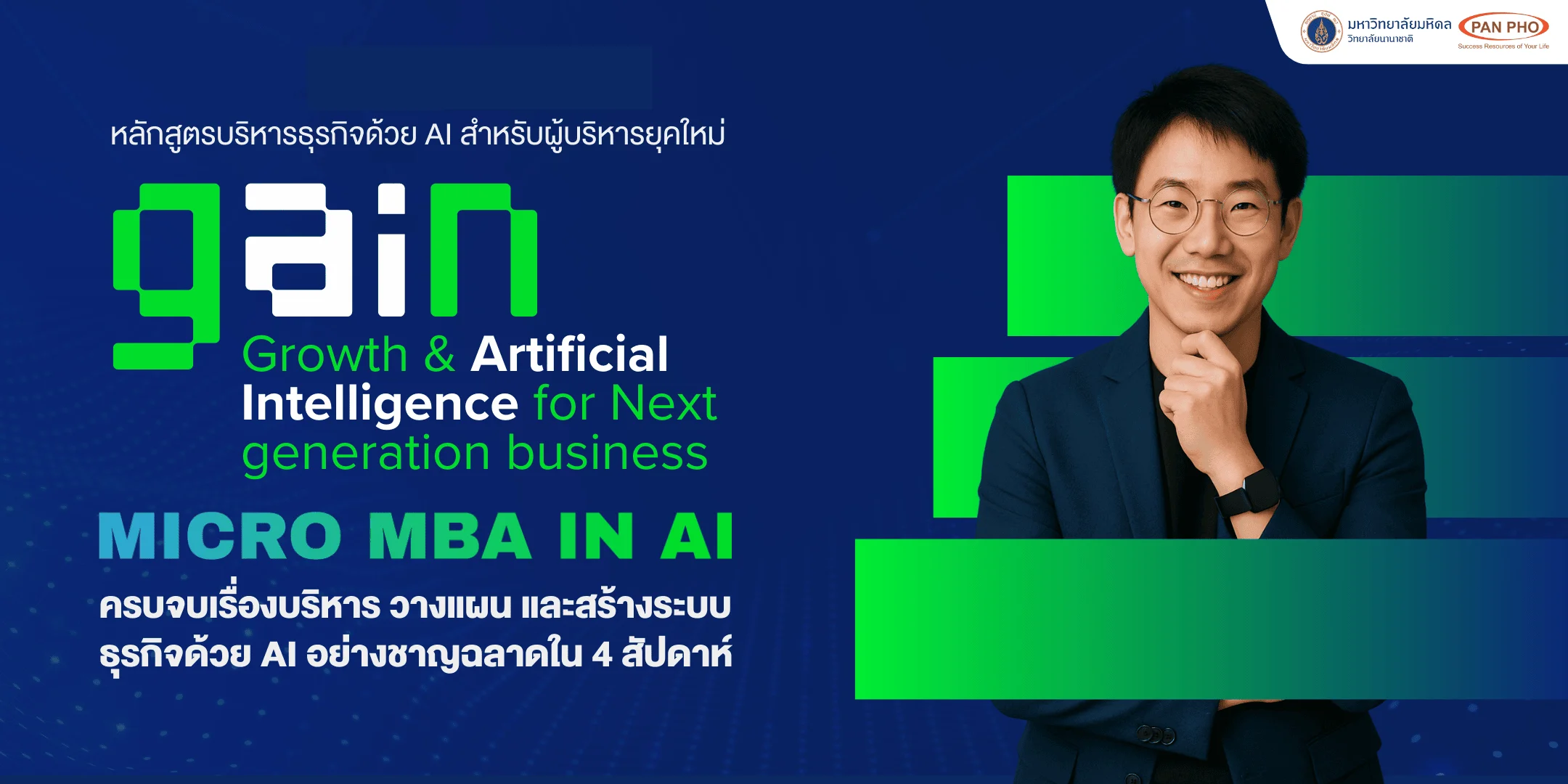 หลักสูตร GAIN: Growth & Artificial Intelligence for Next generation business คือหลักสูตรเข้มข้น 4 สัปดาห์ ที่พัฒนาโดยบริษัท แพน โฟ จำกัด ร่วมกับวิทยาลัยนานาชาติ มหาวิทยาลัยมหิดล (MUIC) เพื่อพาคุณเจาะลึกกระบวนการบริหารจัดการด้วยการใช้ปัญญาประดิษฐ์ (Artificial Intelligence) ผ่าน “การวางแผน”, “การวางกลยุทธ์” และ “การลงมือทำ” อย่างเป็นระบบ