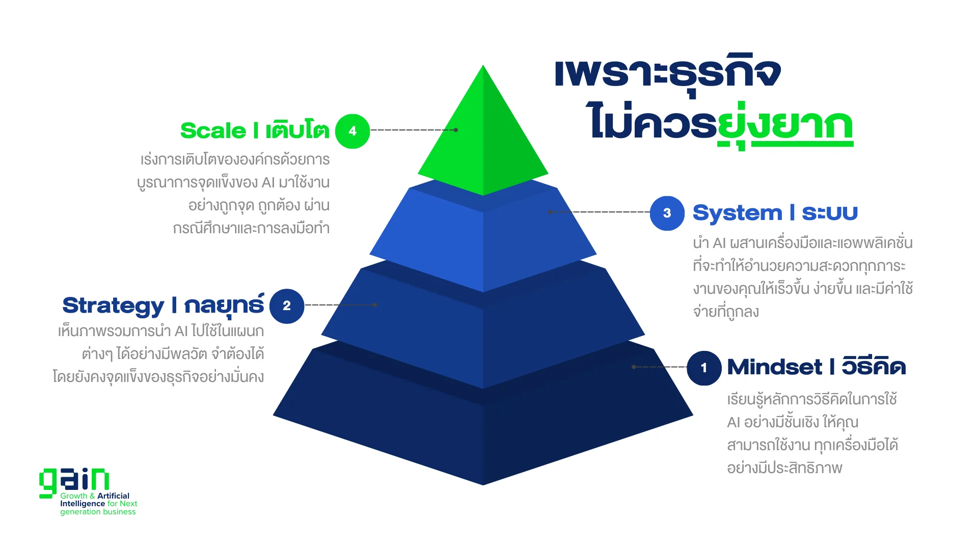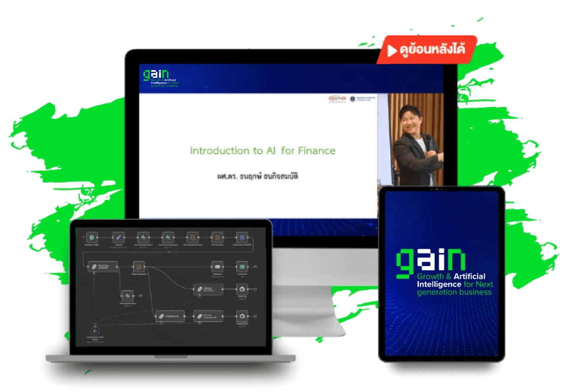หลักสูตร GAIN: Growth & Artificial Intelligence for Next Generation Business คือหลักสูตรที่จะเปลี่ยนเกมการทำธุรกิจของคุณ หลักสูตรนี้จะสอนวิธีการดึงศักยภาพของ AI มาใช้ในการดำเนินการธุรกิจของคุณอย่างเป็นระบบ วัดผลได้ และไม่ต้องเสียเวลาในการลองผิดลองถูกเครื่องมือที่ไม่มีประสิทธิภาพ