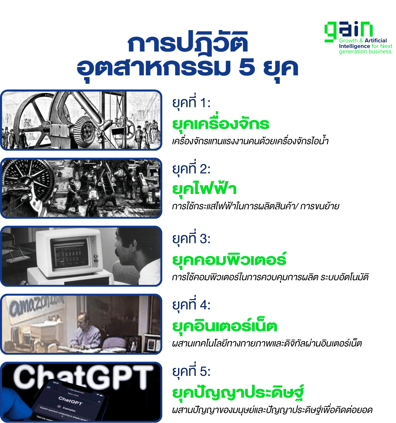 กาลเวลาผ่านมา.. เรากำลังจะเข้าสู่การปฎิวัติอุตสาหกรรมครั้งที่ 5 นั่นคือการทำงานด้วยระบบ AI ในธุรกิจ ซึ่งไม่ว่าคุณจะชอบหรือไม่.. ความเป็นจริงก็จะยังคงเหมือนเดิมคือ คนที่พร้อมจะเปลี่ยนแปลงคือผู้ที่อยู่รอดและได้รับโอกาสที่ยอดเยี่ยมที่สุดในช่วงชีวิต ในขณะที่คนที่ไม่รู้หรือไม่คิดจะเปลี่ยนแปลง จะถูกคนกลุ่มแรกนั้นแย่งโอกาสไป