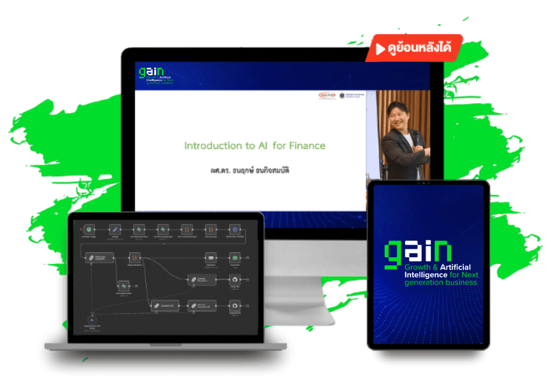 หลักสูตร GAIN: Growth & Artificial Intelligence for Next Generation Business คือหลักสูตรที่จะเปลี่ยนเกมการทำธุรกิจของคุณ หลักสูตรนี้จะสอนวิธีการดึงศักยภาพของ AI มาใช้ในการดำเนินการธุรกิจของคุณอย่างเป็นระบบ วัดผลได้ และไม่ต้องเสียเวลาในการลองผิดลองถูกเครื่องมือที่ไม่มีประสิทธิภาพ