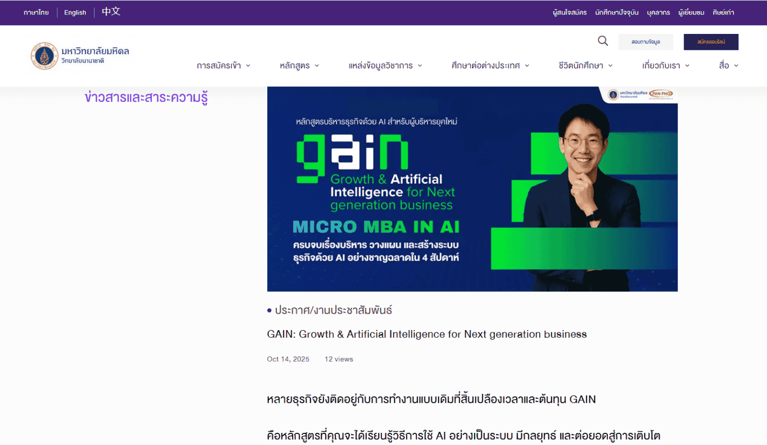 หลักสูตร GAIN: Growth & Artificial Intelligence for Next generation business ได้ถูกสร้างและออกแบบจากบริษัท แพน โฟ จำกัด และวิทยาลัยนานาชาติ มหาวิทยาลัยมหิดล ซึ่งได้รับการไว้วางใจในการจัดจำหน่ายและประชาสัมพันธ์แต่เพียงผู้เดียว ทั้งนี้ สามารถเข้าดูรายละเอียดความร่วมมือระหว่างวิทยาลัยนานาชาติ มหาวิทยาลัยมหิดลได้ที่ปุ่มด้านล่าง