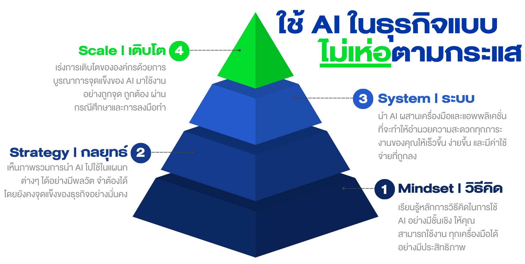 ครอบคลุมทุกมิติตั้งแต่วิธีคิดการใช้ AI กลยุทธ์ และหลักการ จนถึงสามารถนำไปสู่ผลลัพธ์อย่างแท้จริงได้ในธุรกิจ - วางแผนการบริหารจัดการ AI เพื่อการเติบโต ไม่ใช่แค่สร้างภาพลักษณ์หรือตามกระแส