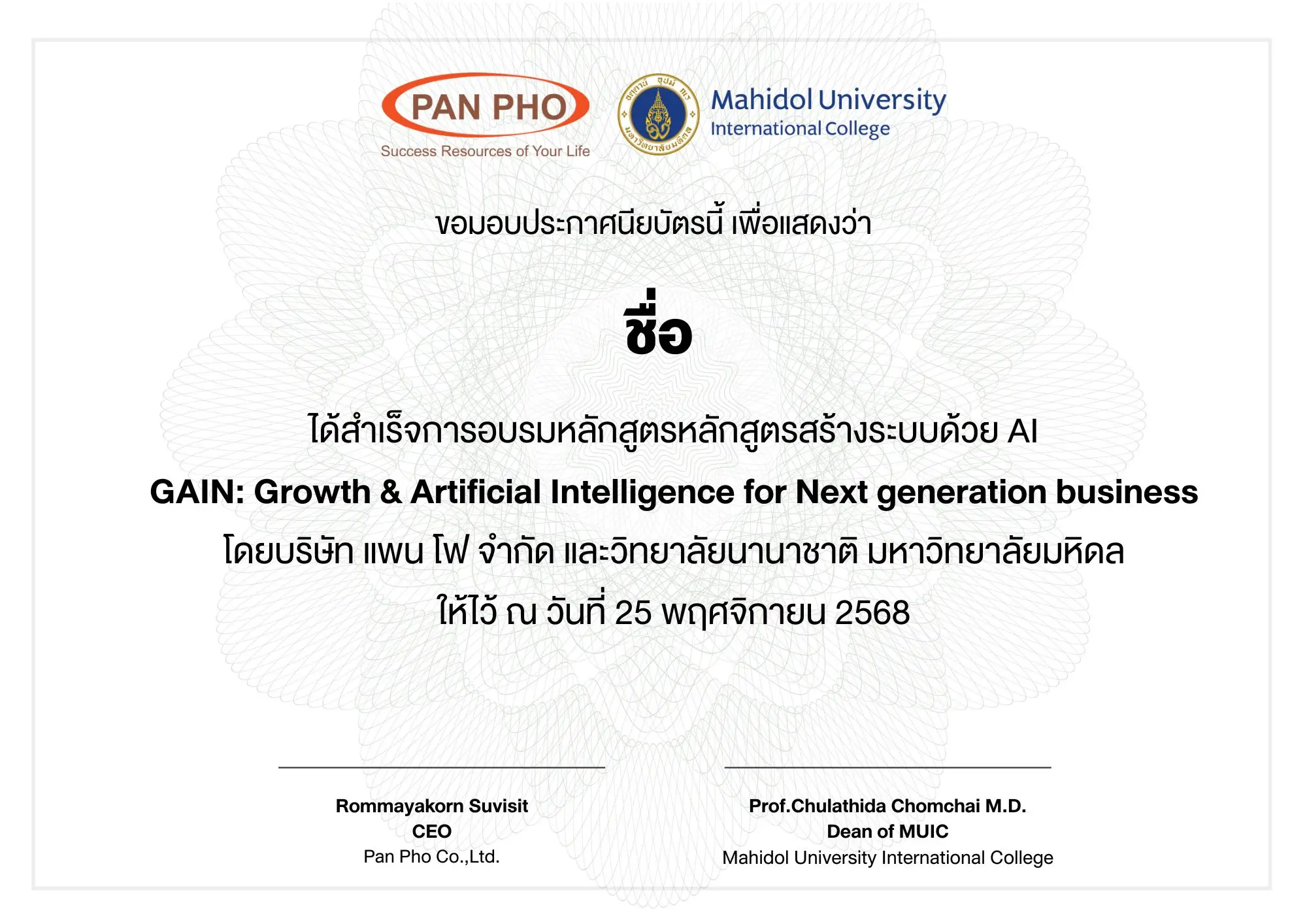 หลักสูตร GAIN: Growth & Artificial Intelligence for Next generation business คือหลักสูตรเข้มข้น 4 สัปดาห์ ที่พัฒนาโดยบริษัท แพน โฟ จำกัด ร่วมกับวิทยาลัยนานาชาติ มหาวิทยาลัยมหิดล (MUIC) เพื่อพาคุณเจาะลึกกระบวนการบริหารจัดการด้วยการใช้ปัญญาประดิษฐ์ (Artificial Intelligence) ผ่าน “การวางแผน”, “การวางกลยุทธ์” และ “การลงมือทำ” อย่างเป็นระบบ