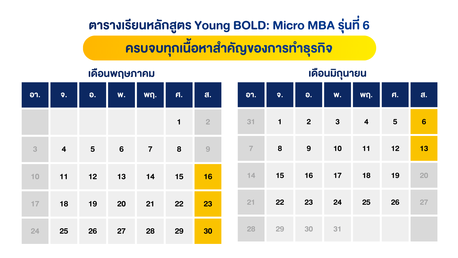 หลักสูตร YOUNG BOLD: MICRO MBA รุ่นที่ 6 วันที่ 16, 23, 30 พฤษภาคม – 6, 13 มิถุนายน 2569 (ทุกวันเสาร์) เวลา 9:00 – 17:30 น. | โรงแรมเลอ เมอริเดียน กรุงเทพ (สุรวงศ์)