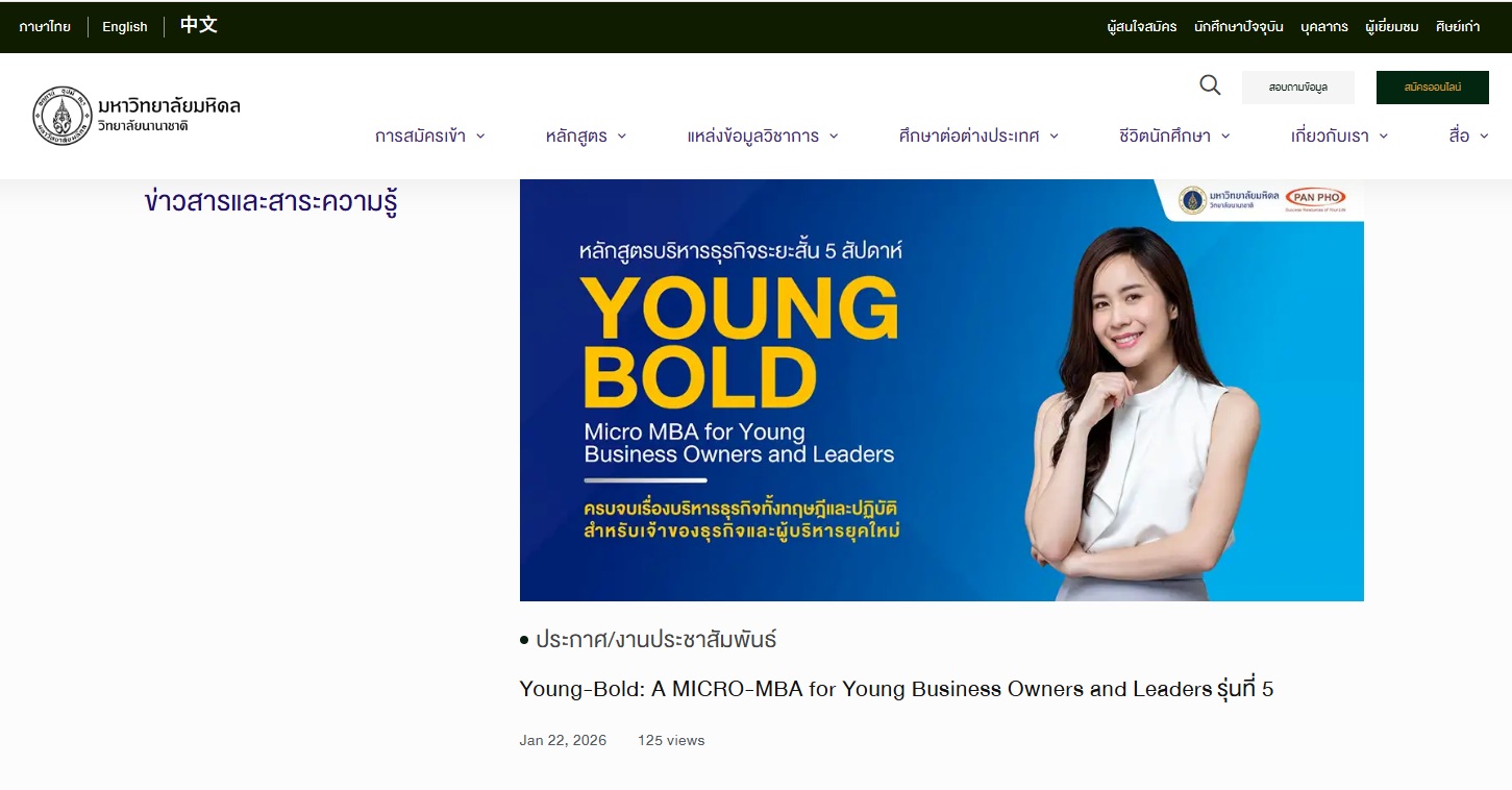 บริษัท แพน โฟ จำกัด ได้รับความไว้วางใจจากวิทยาลัยนานาชาติ มหาวิทยาลัยมหิดล ในการเป็นพันธมิตรแต่เพียงผู้เดียวในการจัดหลักสูตรและประชาสัมพันธ์อย่างเป็นทางการ
