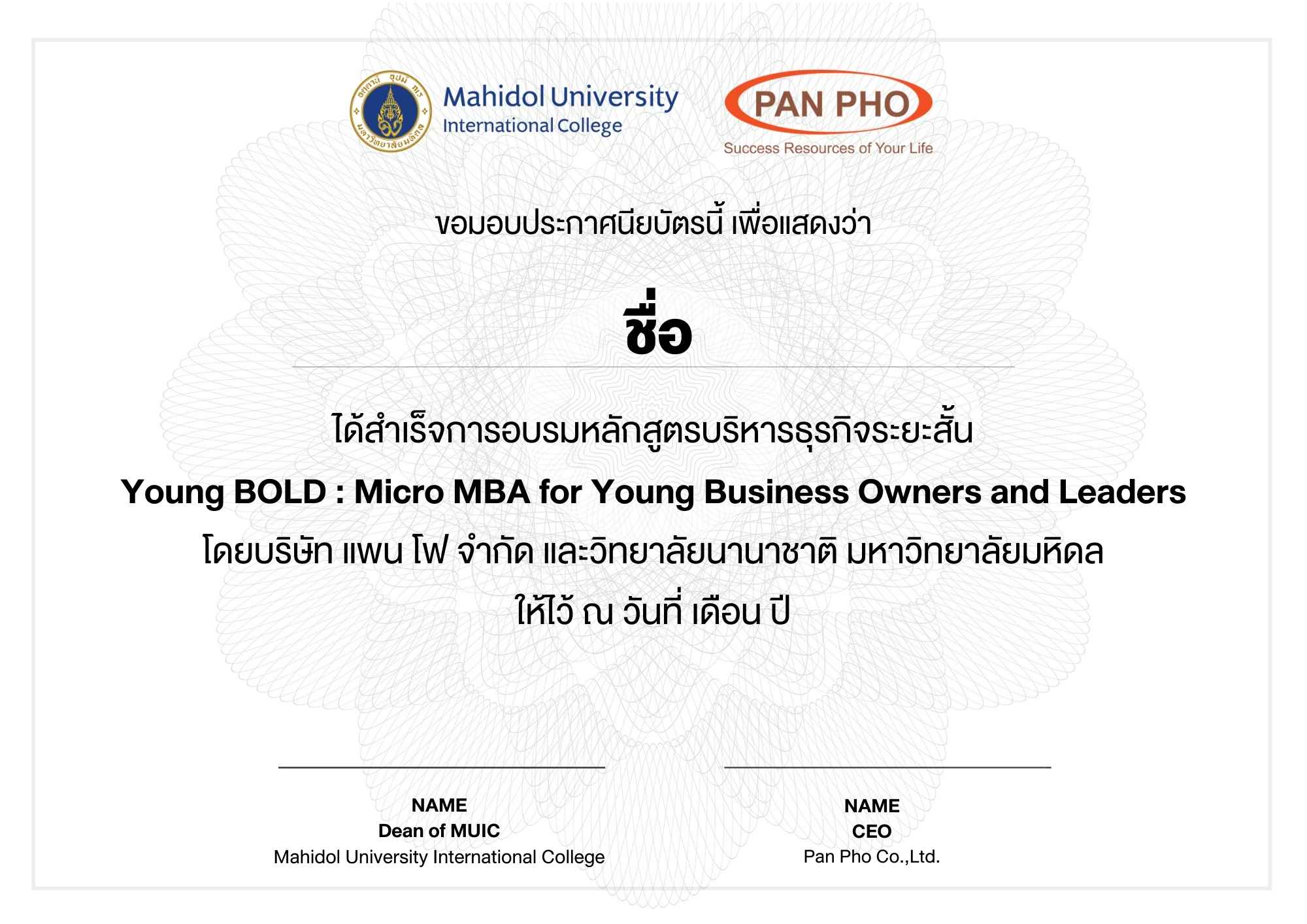 หลักสูตร YOUNG BOLD: MICRO MBA คือหลักสูตรเข้มข้น 5 สัปดาห์ที่ออกแบบหลักสูตรโดยบริษัทแพน โฟ จำกัด ร่วมกับ วิทยาลัยนานาชาติ มหาวิทยาลัยมหิดลเพื่อเตรียมความพร้อมสำหรับเจ้าของธุรกิจและผู้บริหารรุ่นใหม่ที่ต้องการปูพื้นฐานการบริหารจัดการธุรกิจ เพื่อต่อยอดไปสู่ความได้เปรียบในโลกแห่งความไม่แน่นอน