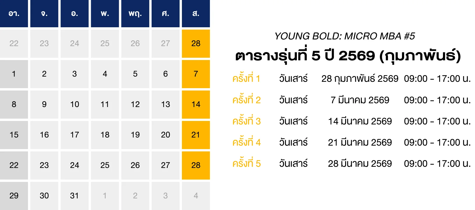 หลักสูตร YOUNG BOLD: MICRO MBA วันที่ 7, 14, 21, 28 กุมภาพันธ์ และ 7 มีนาคม 2569 (ทุกวันเสาร์)  เวลา 9:00 – 17:30 น. | โรงแรมเลอ เมอริเดียน กรุงเทพ (สุรวงศ์) หรือ เรียนสดออนไลน์ผ่านโปรแกรม Zoom Interactive